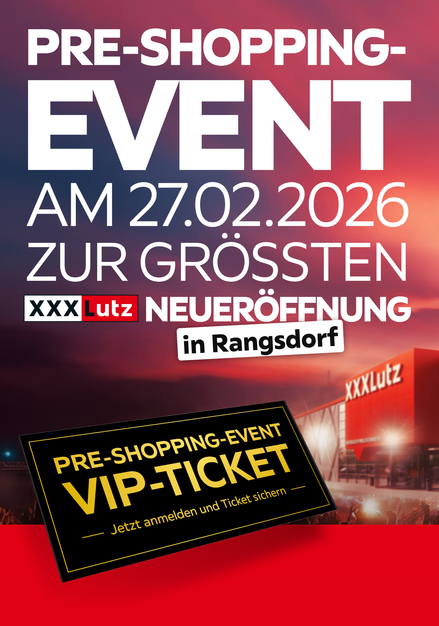 Erleben Sie als einer der ersten Gäste unsere brandneue Filiale – noch vor der offiziellen Eröffnung. Im Rahmen unseres exklusiven Pre-Shopping-Events am Freitag, den 27.02.2026 ab 17:00 Uhr (Einlass) erwartet Sie ein Abend voller Highlights (Red Carpet-Vibes, Artisten u.v.m. ). Lassen Sie sich dieses einmalige Event nicht entgehen und sichern Sie sich jetzt einen der begrenzten Plätze. Eine Anmeldung vorab ist zwingend erforderlich.
